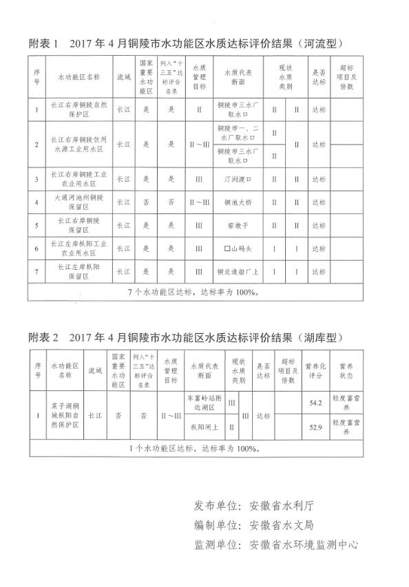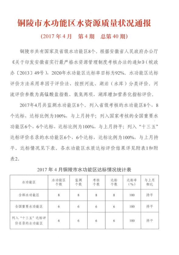 铜陵市水功能区水资源质量状况通报2017年第4期