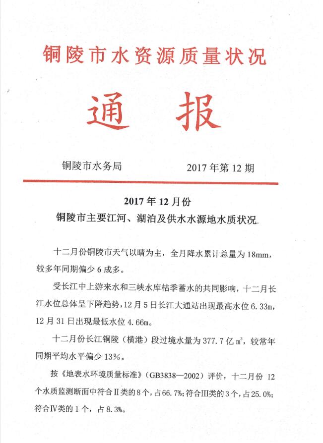 2017年12月份铜陵市水资源质量状况通报